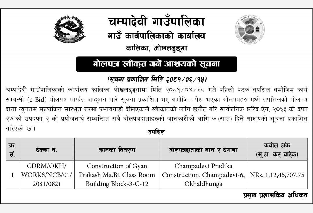बोलपत्र आह्वान तथा बाेलपत्र स्वीकृत गर्ने सम्वन्धी सुचना ।